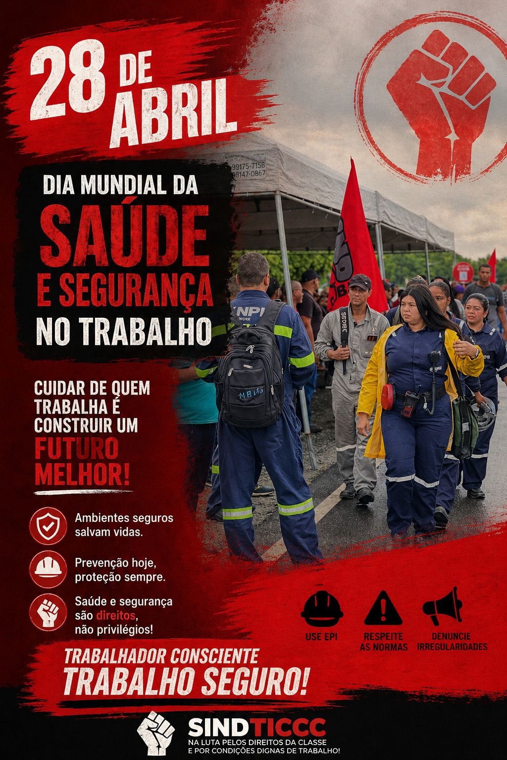 As causas são conhecidas: jornadas puxadas, falta de equipamentos adequados, treinamentos que não saem do papel e fiscalização insuficiente. Mudar esse quadro é possível — e é exatamente por isso que o Sindticcc não abre mão dessa luta. Saúde e segurança no trabalho estão entre as prioridades do sindicato no dia a dia de defesa da categoria, porque todo trabalhador merece exercer sua profissão com dignidade e voltar pra casa inteiro ao fim do expediente.